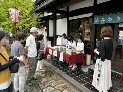 写真上は、林盛堂での販売の様子です。たくさんのお客さんがきておられます。