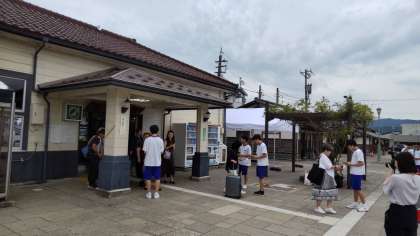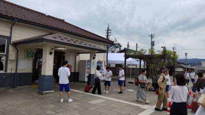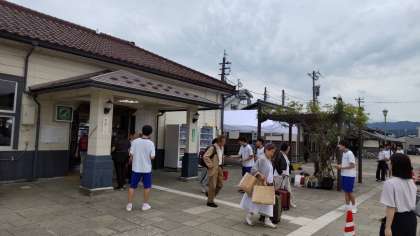 八尾駅前で、案内部が観光客にパンフレットを配布しています。たくさんの観光客が八尾駅に到着!列車から降りてこられた観光客にそれぞれパンフレットを持って話しかけています。