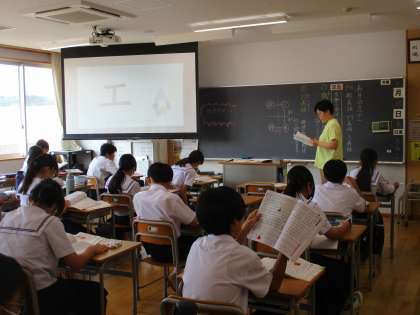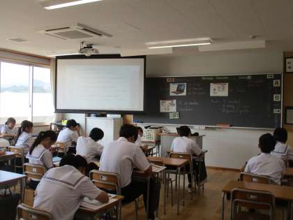 地域の方々のおかげで設置することができたプロジェクターを使って、スクリーンに映し出して学習を進めています。