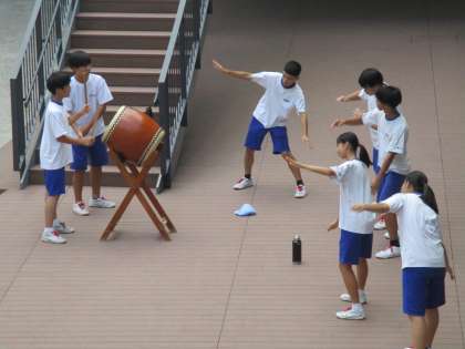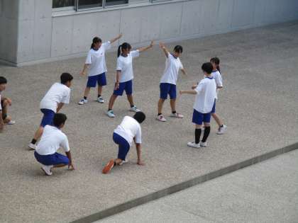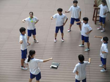 学びのニワ(通称中庭)では、各団、明日の団活動に向けて、団リーダーで仕上げの練習中です。