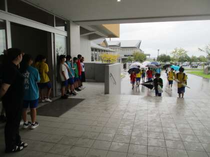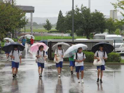 9月19日(木) あいにくの雨模様 公開日 2024/09/19 更新日 2024/09/19 八尾中学校のページ 大雨警報が富山市に出ています。昨夜も激しい雷雨でしたね。 生徒が登校する時間帯は小雨ですが、本日予定していた予行練習は明日に延期としました。 1年生の学年生徒会企画で、朝から1年生が生徒玄関前で挨拶運動をしています。素敵な挨拶で雨を吹き飛ばしてください。