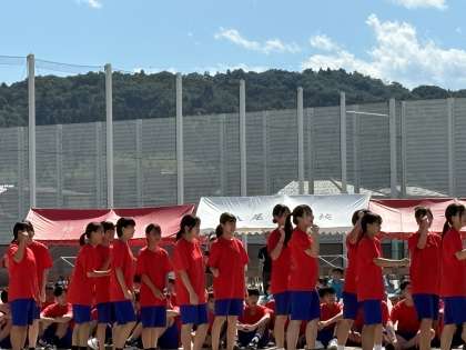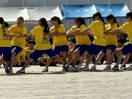 まずは、女子の部。赤団VS黄団です。気合い入れからスタートです。