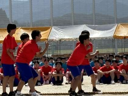 緑団は、ハカで気合い入れをしています。赤団はソーランで気合い入れをしています。