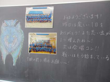 昨日の頑張りを労うメッセージと写真が黒板に貼ってあります。素敵な思い出のページが追加されましたね。