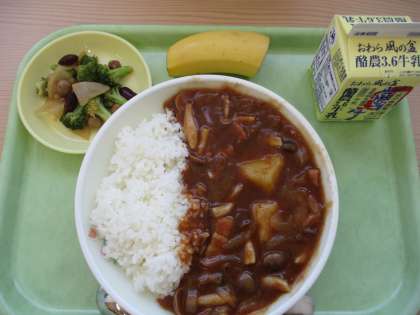 た(たまねぎ)、べ(ベーコン)、き(きのこ)、りん(りんご)が入ったハヤシライスです。トマト味が効いていて美味しいですね。
