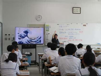 葛飾北斎の作品を見ながら、版画の学習について話を聴いています。