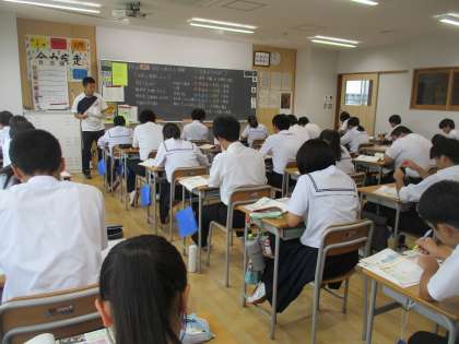 写真上は、社会の授業の様子です。選挙について学習しています。総裁選の直後、生徒会選挙の直前とタイムリーな内容です。