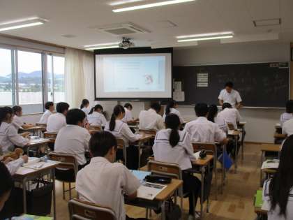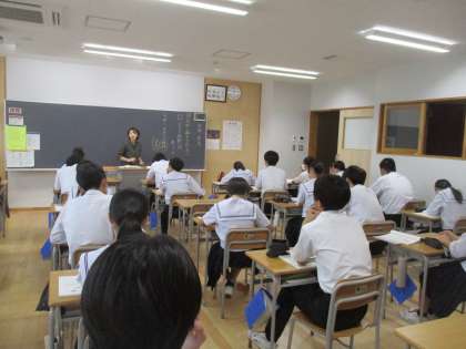 写真中は、英語の授業の様子です。A Mother's Lullabyという広島の原爆について書かれた読み物を読み取っています。修学旅行で訪れた広島原爆記念公園のことを思い出しますね。