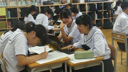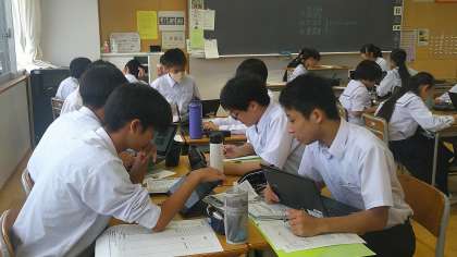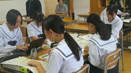 今回は、クラスの枠を外して、研究課題が同じテーマの班になっています。生徒は、積極的に見学先を調べたり、話し合いに参加したりしています。