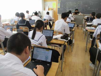 写真下は、技術の授業の様子です。chromebookを使って、振り返りをしています。