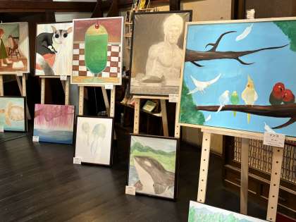 おやつの場所をお借りして、美術部の作品が所狭しと展示してあります。ぜひお越しください!