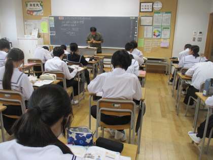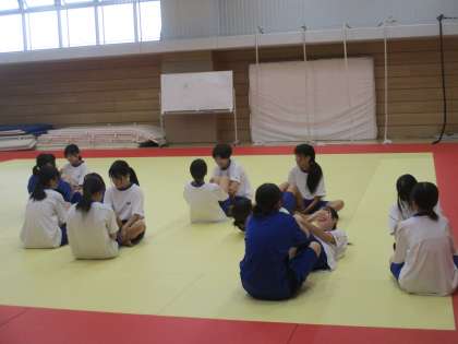 写真上・中は、保健体育の授業の様子です。ペアで準備運動中です。