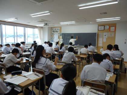 写真下は、社会の授業の様子です。内閣の構造、メンバーの構成等について学習しています。