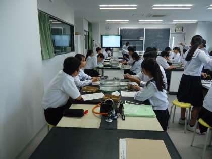 写真上は、理科の授業の様子です。浮力の大きさについて実験で確かめています。