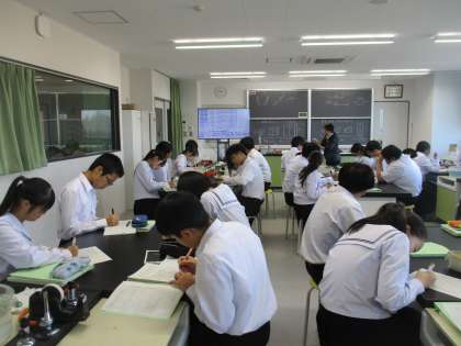 写真上は、理科の授業の様子です。浮力について学習しています。