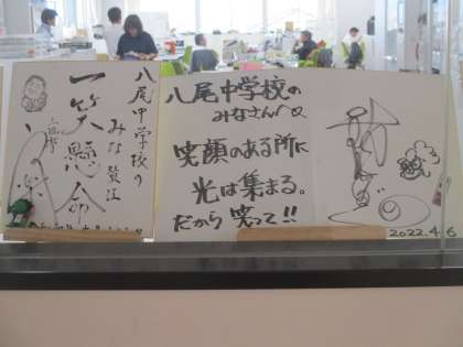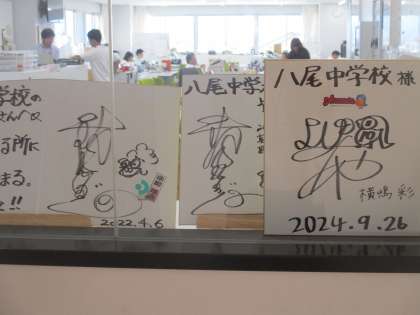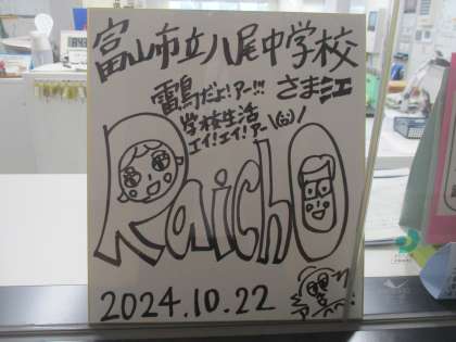 昨日、お越しいただいた「雷鳥」さんが、八尾中学校へサイン入り色紙をプレゼントしてくださいました。