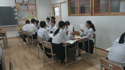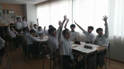 本日2年生は、富士通のSDGsプログラムに参加しました。先日、事前学習として「こんなものがあったらいいな」と困っている人の状況を分析し、「サービス」「情報」「交通」の3つの分野に分かれ、「ソリューション(解決)に挑戦しました。今日は、その考えたソリューションを千葉県、兵庫県の中学校とオンラインで意見交換したり、富士通の担当者からアドバイスをいただいたりしました。
