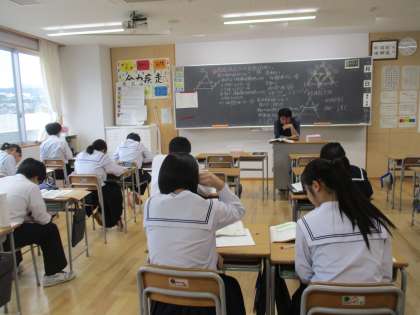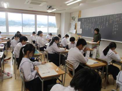 写真上は、国語の授業の様子です。中間考査の解説中です。
