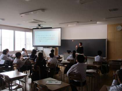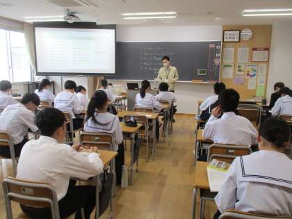写真上は、国語の授業の様子です。大きなスクリーンに注意点を映し出しながら、テストの解説をしています。