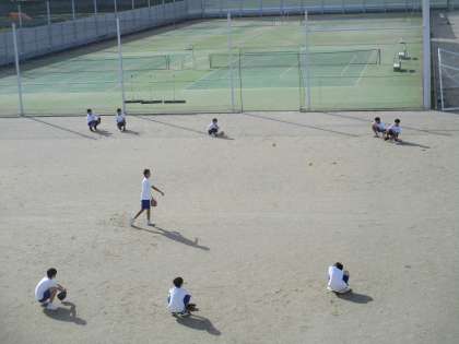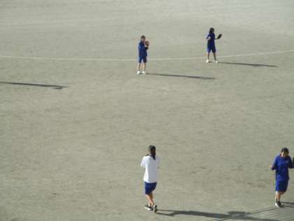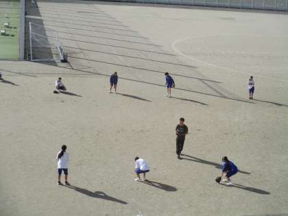 少し肌寒いですが、グラウンドでソフトボール競技の学習をしています。