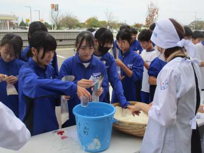 1組から順に、持ち寄った米を専用の袋に入れ、水を入れて準備をしています。この後、大きな釜で袋ごと米を炊き、レトルトカレーも一緒に煮て、カレーを食べます。