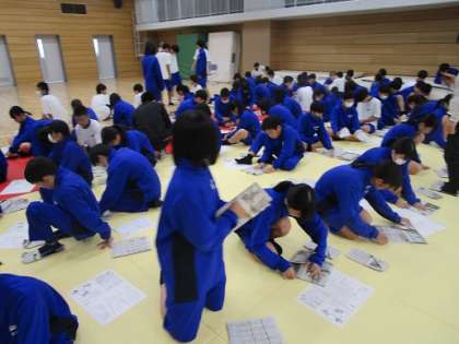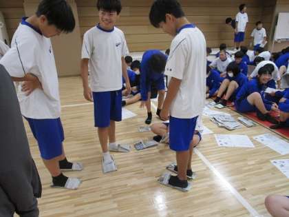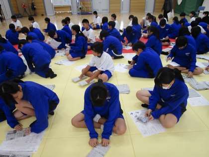 避難所での生活に必要なスリッパを、新聞紙で作るテクニックを伝授してもらいました。十分実用に耐えるスリッパができ、みんな感心していました。