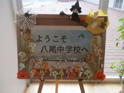 生徒玄関前のウエルカムボードにもジャックオーランタンや蜘蛛の巣が追加され、ハロウィン仕様になっています。