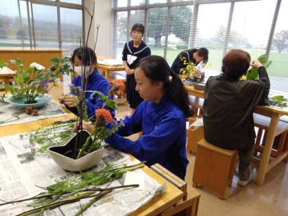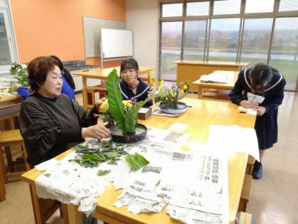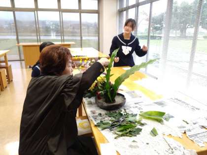 華道部は、明日から始まる八尾町文化祭に作品を出品するための準備をしています。講師の先生の指導の下で、花を生けています。