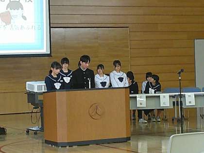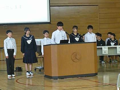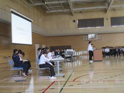 後期生徒会会長の挨拶、スローガン案の発表、執行委員会から各専門委員会の活動計画案の発表を行いました。