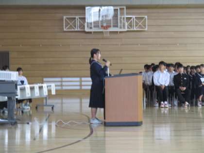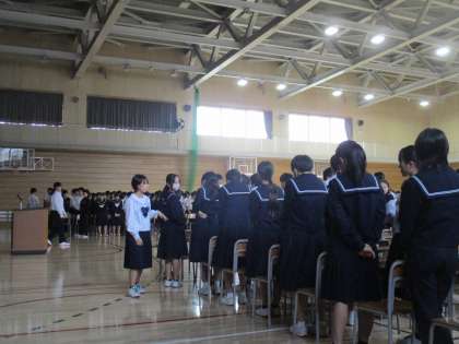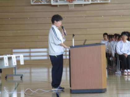 最後に生徒会担当の先生から、「3年生はしっかりとバトンを渡し、1・2年生が走り抜けていく姿を見守り支えてほしい」「1・2年生は3年生から受け取ったバトンの重みを感じとり、しっかりとバトンをもって走り続けてほしい」とエールが送られました。