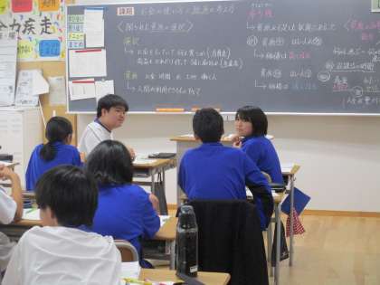 教科担当の先生が、「ありときりぎりす」の紙芝居を声色を変えながら読み聞かせています。国語の授業ではなく、社会の授業です。