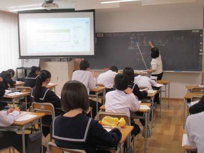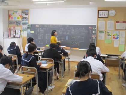 写真上は、数学の授業の様子です。比例係数について復習しています。