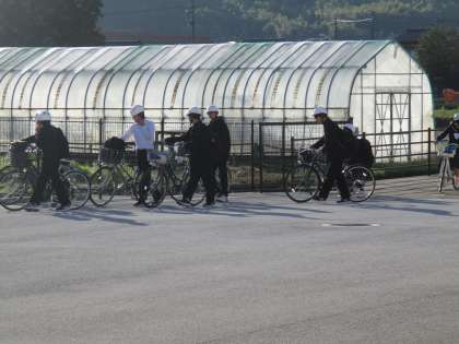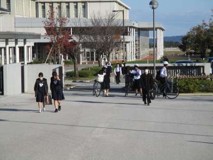 最低気温が5度と、寒い朝です。快晴の空の下、生徒が元気に登校しています。