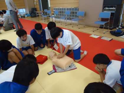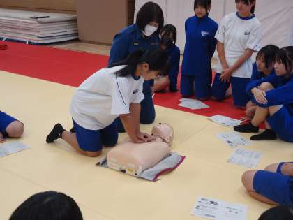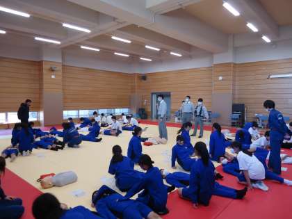 八尾消防署の職員の方から、救命措置の方法を学んでいます。緊急時に落ち着いて、救命措置ができるように、実技講習を受けています。