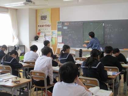 写真下は、数学の授業の様子です。比例のグラフを書いています。グラフは最後まで線を引くことがポイントです。