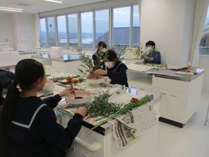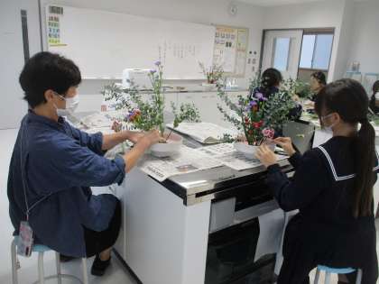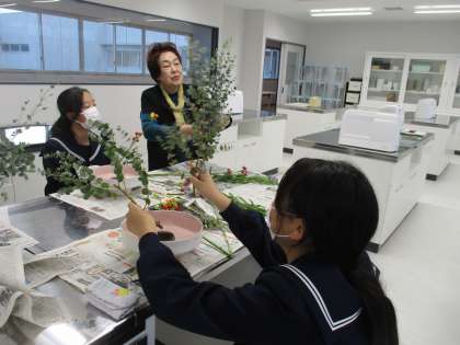 今日は、華道部の活動日です。講師の先生にご指導いただいています。