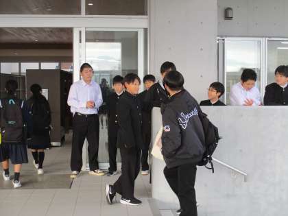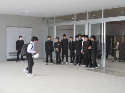 生徒玄関前では、卓球部、男子バスケットボール部1年生が挨拶運動をしています。生徒玄関前だけ気温が若干上がっている気がします。