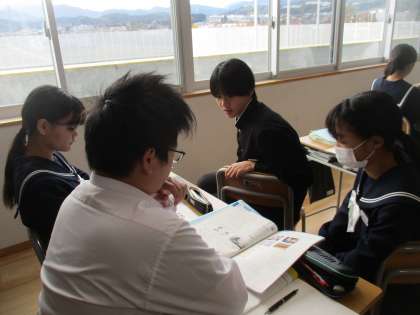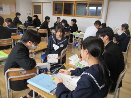 話題やポイントを読み取り、ペアやグループで共有しています。3年生は隣同士机をくっつけてペアで学習しています。