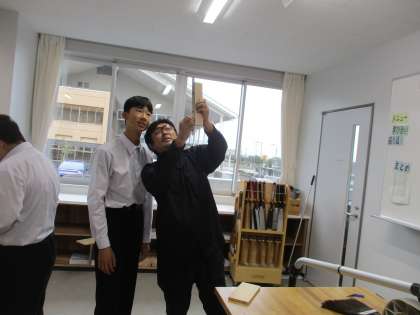 のこぎりで切った後は、担当の先生にチェックを受けています。