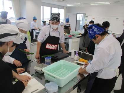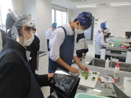 乱切り、千切り、輪切り等の様々な手法できゅうりを切る学習です。