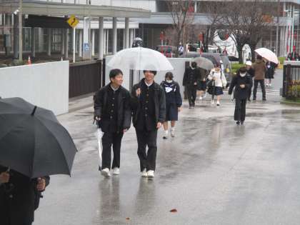 今朝は雨の朝になりました。傘をさしながら登校しています。