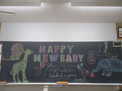 お子さんが誕生した担任の先生を祝おうと、朝から生徒はそわそわと準備をしています。