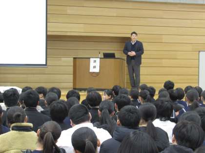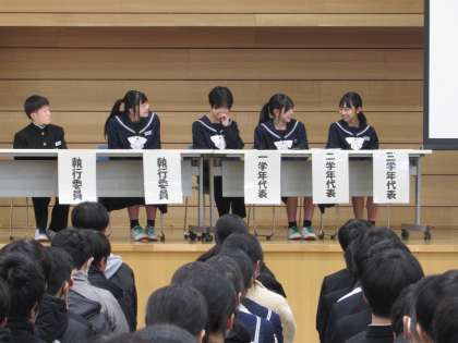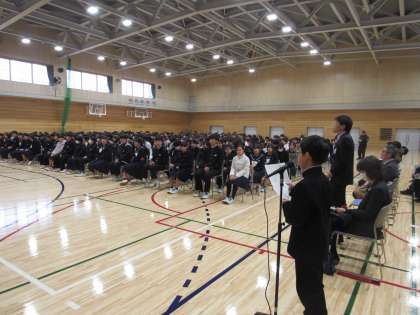 12月9日(月) 人権集会 その1 公開日 2024/12/09 更新日 2024/12/09 八尾中学校のページ 本日6限目に、全校生徒で「人権集会」を行いました。 講師として本校スクールソーシャルワーカーの 村上 満先生に「心って何だろう」をテーマにご講演をいただきました。 さらに生徒の代表として5名の生徒(各学年の代表3名、執行委員2名)がパネラーとしてステージに上がり、自分の意見や思いを発表しました。
