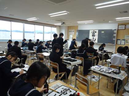 写真上は、国語の授業の様子です。「行書を練習しよう」という課題の下、練習に励んでいます。