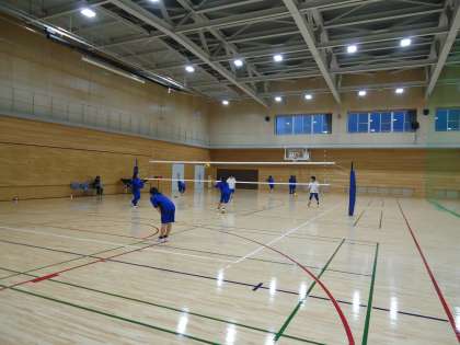 体育館では、バレーボール部が元気よくレシーブ練習をしています。