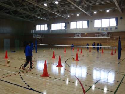 バレーボール部は、サーブ練習中です。カラーコーンに当てないよう、場所を狙ってコントロールしながら打つ練習に取り組んでいます。