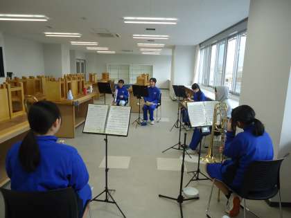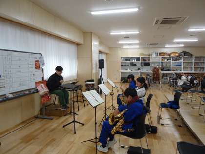 吹奏楽部はパートに分かれて練習中です。それぞれのパートで心を合わせて、練習しています。