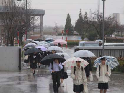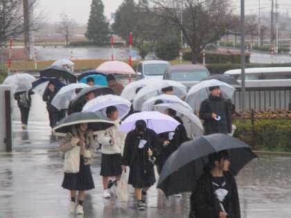 スクールバスが到着すると、コートを着込んだたくさんの生徒が、色とりどりの傘を一斉に広げ元気に登校してきます。