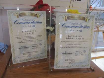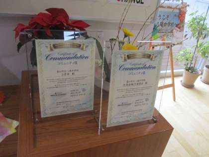昨年末、新聞にも掲載されていた「ボランティア・スピリット・アワード コミュニティ賞」の盾です。  生徒会執行委員会、3学年の2つも受賞しています。