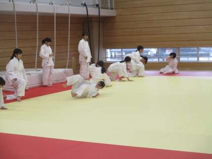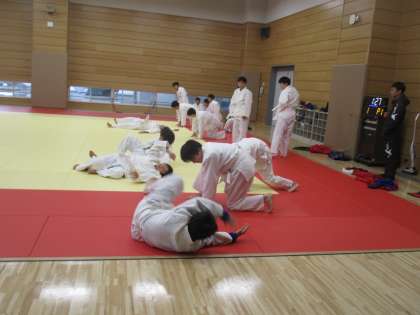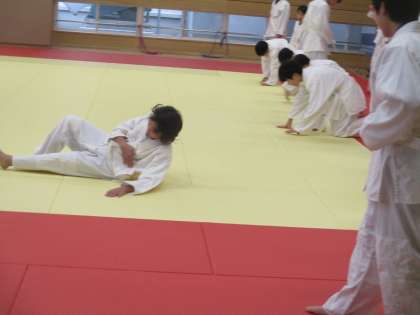 受け身の練習をしています。互いに教え合っています。